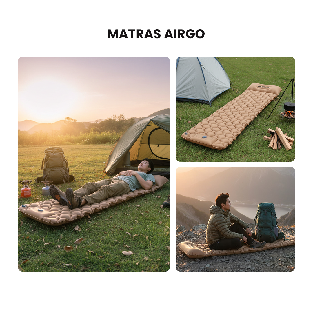 Airgo adalah kasur angin tiup serbaguna yang dirancang khusus untuk aktivitas outdoor seperti camping, hiking, traveling, dan adventure. Dengan pompa kaki bawaan, kamu bisa mengisi udara hanya dalam hitungan detik tanpa perlu alat tambahan. Ringan, anti bocor, dan tahan air – Airgo adalah solusi tidur nyaman di alam bebas!